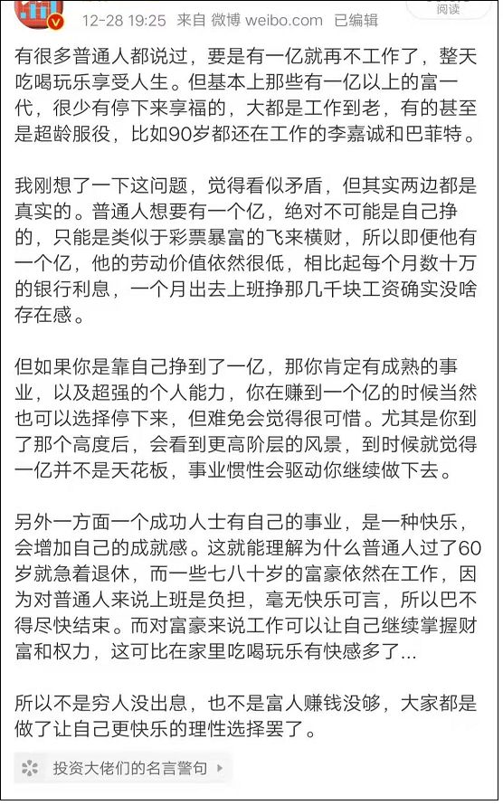 坦率说工作(真正属于自己的)还是挺让人上瘾的。而且到了一定位置,手头的资源,人脉,机会放弃了会觉得可惜。说挣到一亿就放手的,大部分本就没有这些资源。duang