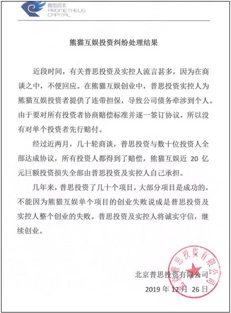 接昨晚的消息,今天最大的瓜是普思投资发布了一个公告,称熊猫直播的连带担保责任,将由普思投资的实控人(王思聪)自己承担,目前已经达成协议,数十位投资人全部获得赔偿,累计总额将近20亿。