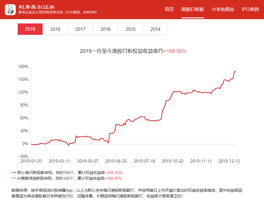 今年是港股打新的大牛市,2019年坚持长期每只新股申购1手的策略,2019年全年到目前包括概率的权益收益率是+168%,所以继续发个利弗莫尔的开户广告,大家考虑一下。不用投太多钱,一个账户投个2-5万,是效率最高的,哪怕不需要特别好的运气,过去一年也通常能获得50%以上的收益率。