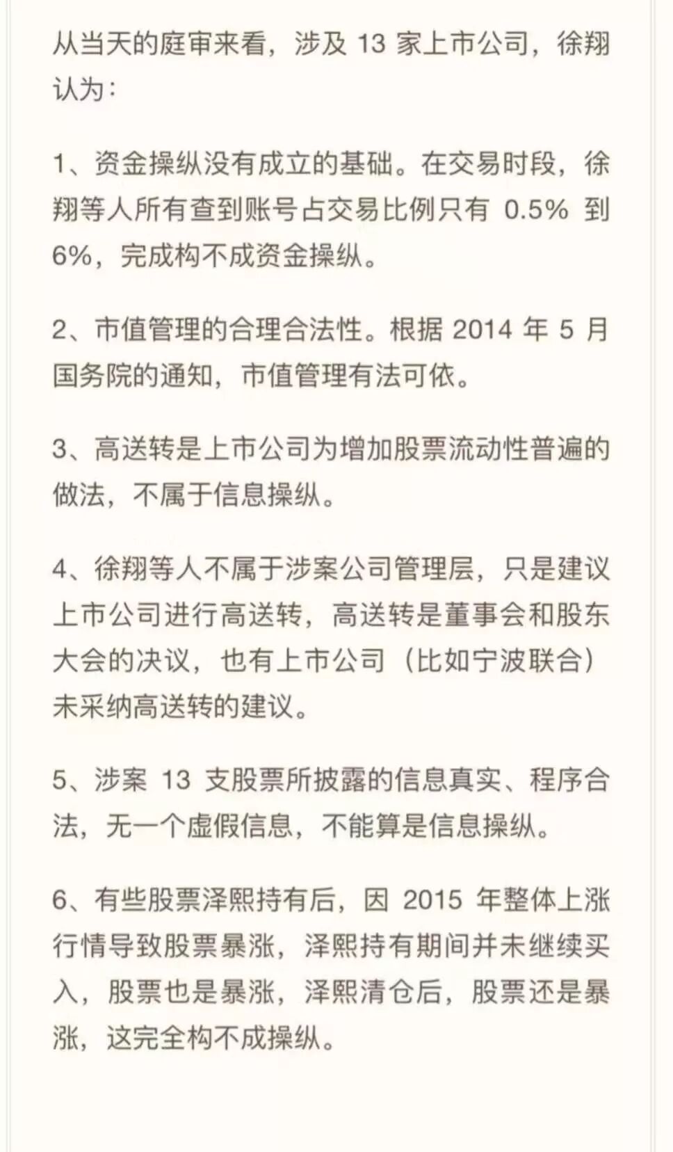 公开信里面有一段引起了我的注意,是庭审上徐翔本人的辩词: