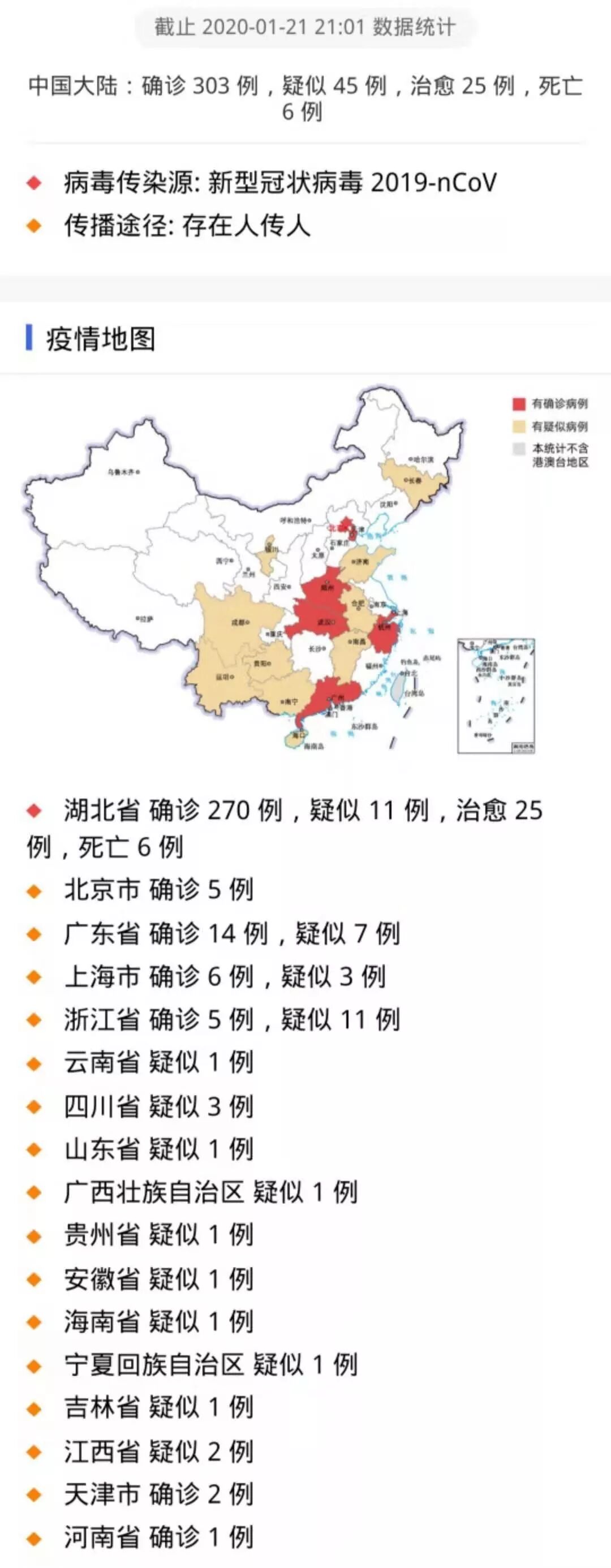 从昨天开始基本上微信群里讨论的话题90%都是这次肺炎疫情,所以一些网络上传的很广泛的信息我就不赘述了,上面这个实况数据看一下就行。另外就是钟南山院士已经确认该病毒会人传人 ,因为在确诊的病例里,有人近期从未去过武汉。
