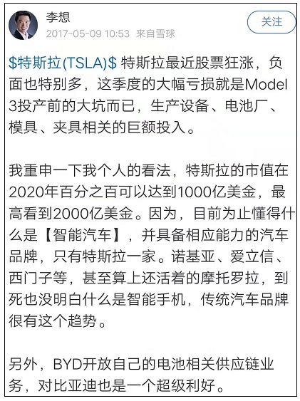 这哥们现在自己也去做电动车了,好像品牌是叫理想one。我觉得他对比传统手机的逻辑有点问题 ,但不管逻辑对不对,起码结果(1000亿美金)让他说对了。